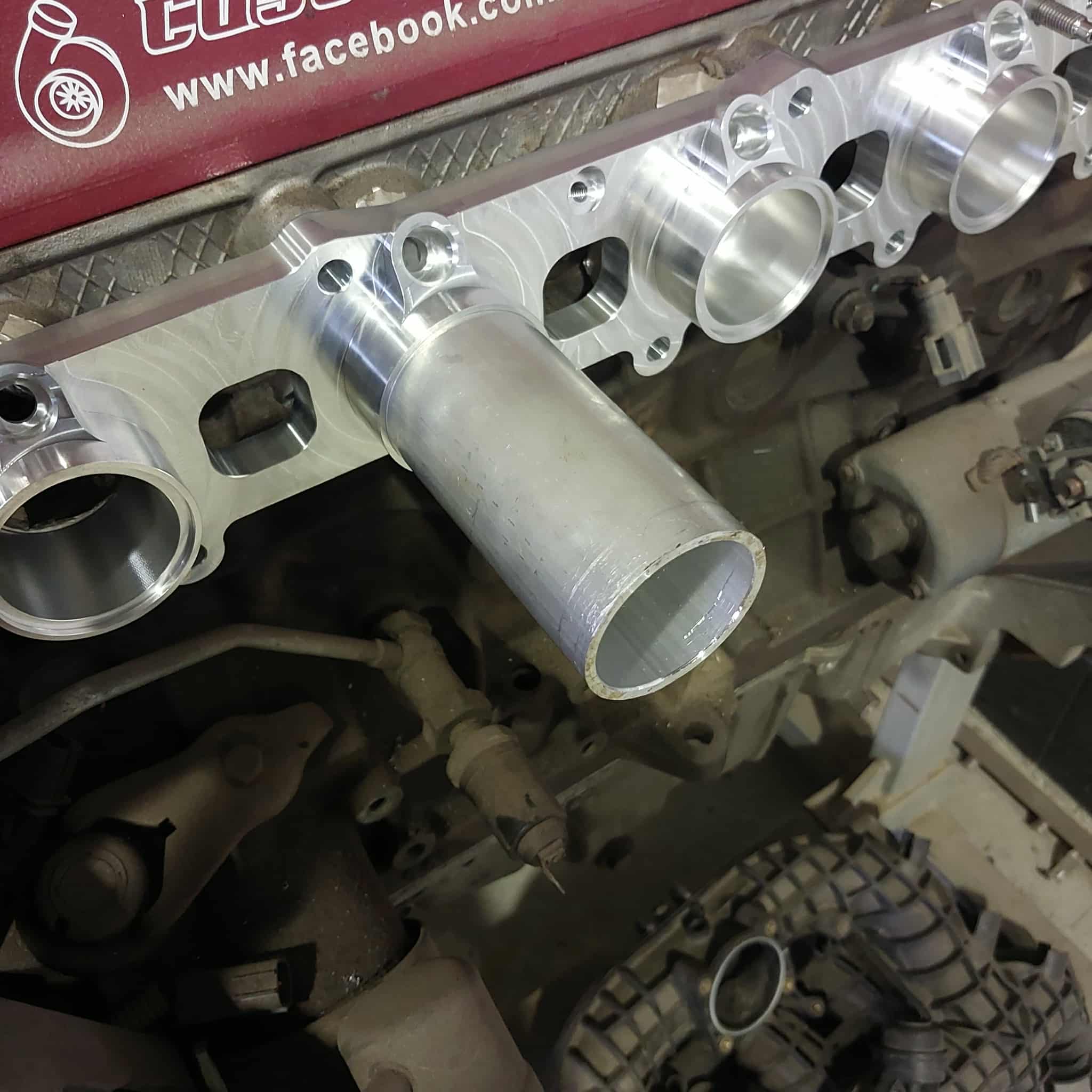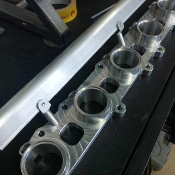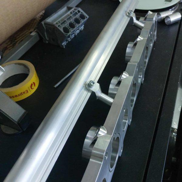 Billet SOHC head flange with injector ports, these are 14mm thick at the base with recessed ports to allow easy alignment when putting together. Also feature orings to seal against the head and made to suit 50x3mm od pipe. Optional -8 fuel rail with brackets.